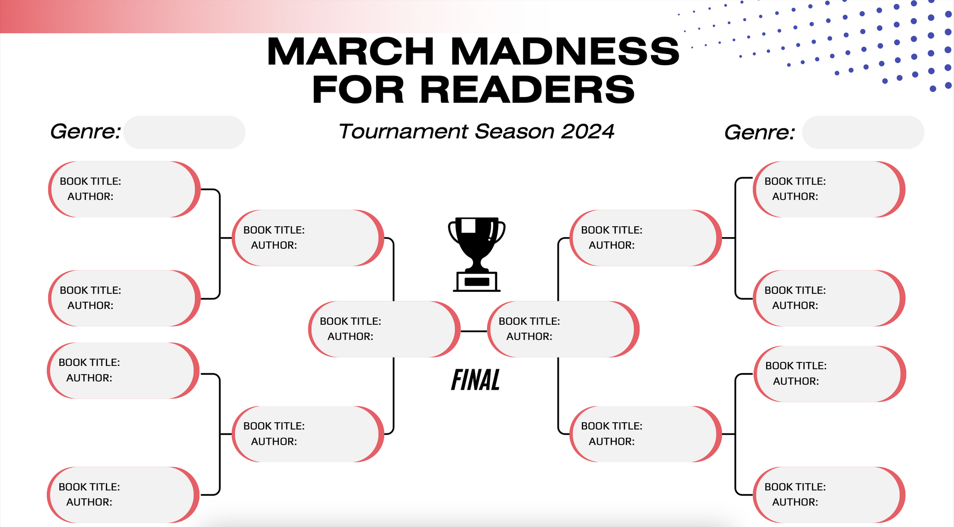 March Madness for Readers. Create your own bracket for the month of March with 8 books and two genres. Fill your bracket in and show how many books you've read by the end of March.